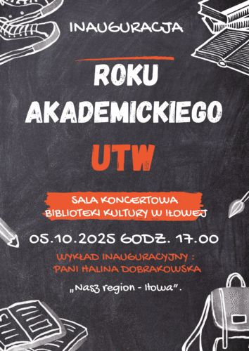 5 października o godz. 17.00 w sali koncertowej Biblioteki Kultury w Iłowej odbędzie się uroczysta INAUGURACJA ROKU AKADEMICKIEGO UTW w trakcie wykład inauguracyjny wygłosi Pani Halina Dobrakowska na temat ,,Nasz region- Iłowa ” .