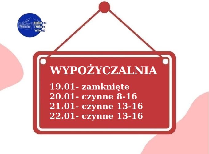 Od poniedziałku 19 stycznia wypożyczalnia Biblioteki Kultury tymczasowo zmienia dni i godziny otwarcia, ze względu na szkolenie i wdrażanie nowego programu bibliotecznego.Informacje na grafice .